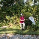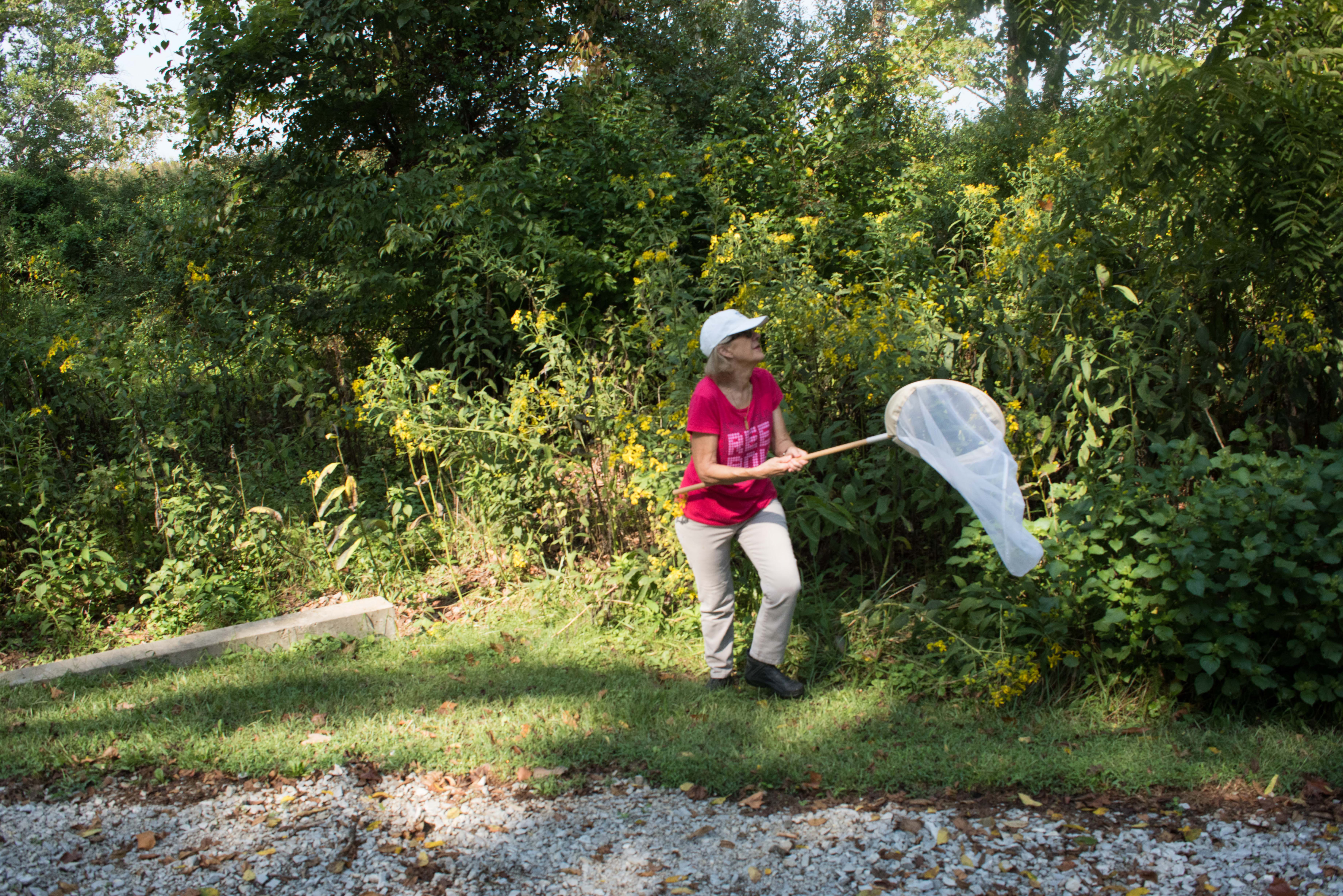 Potomac Valley Audubon Society (PVAS) volunteer netting monarch butterfly.