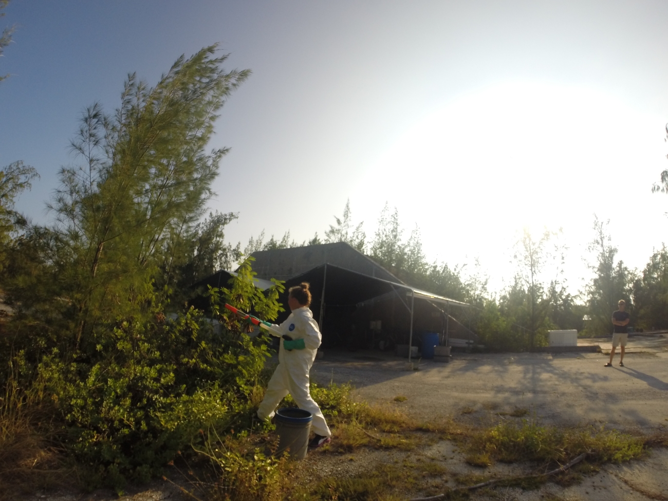 A volunteer, Margeaux Wayne, sprays bait with insecticide to help eradicate invasive yellow crazy ants at Johnston Atoll National Wildlife Refuge in the Pacific. The invasive ants torment and blind ground-nesting seabirds on the island.