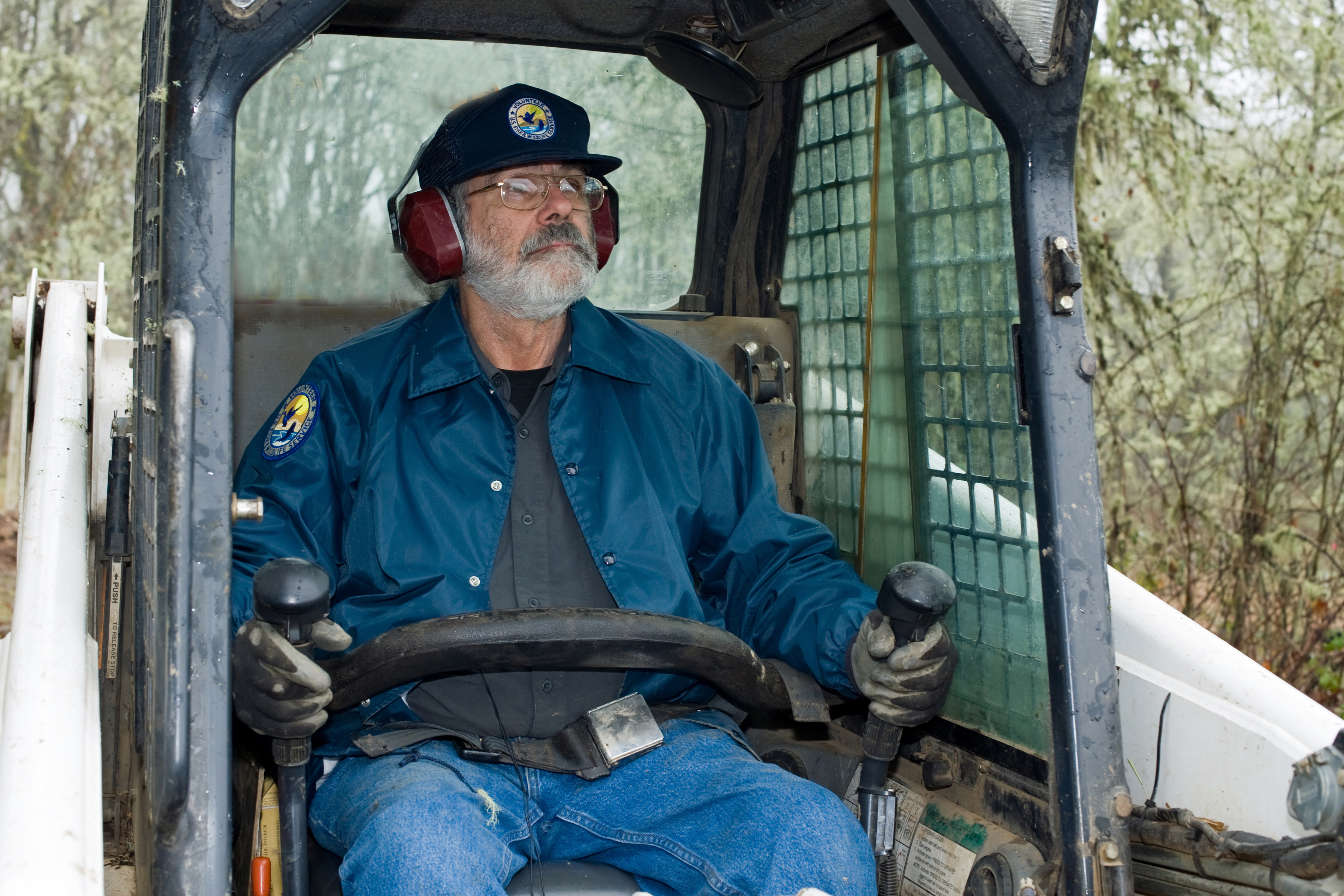 Volunteer operates backhoe while conducting trail maintenance at William L. Finley NWR