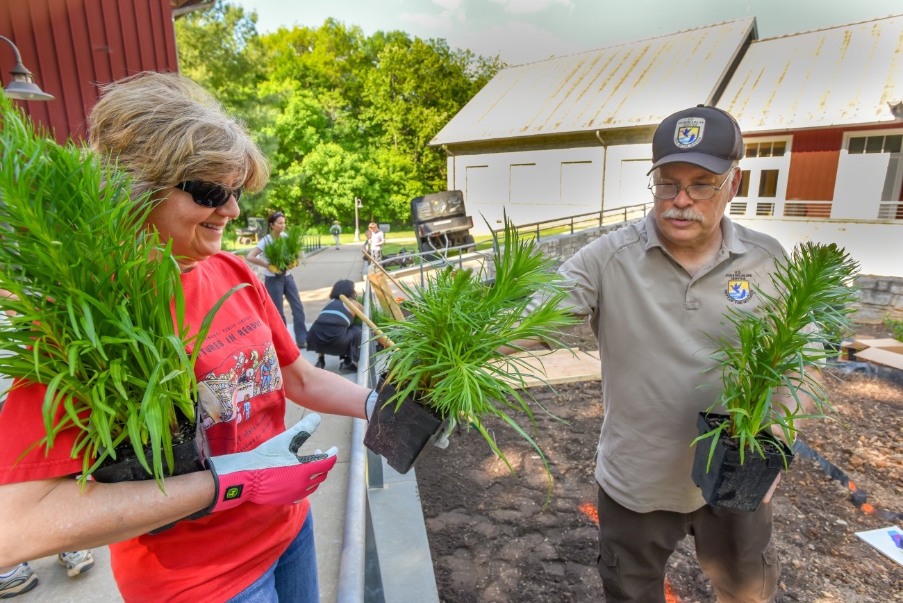 Volunteers and employees plant a monarch garden
