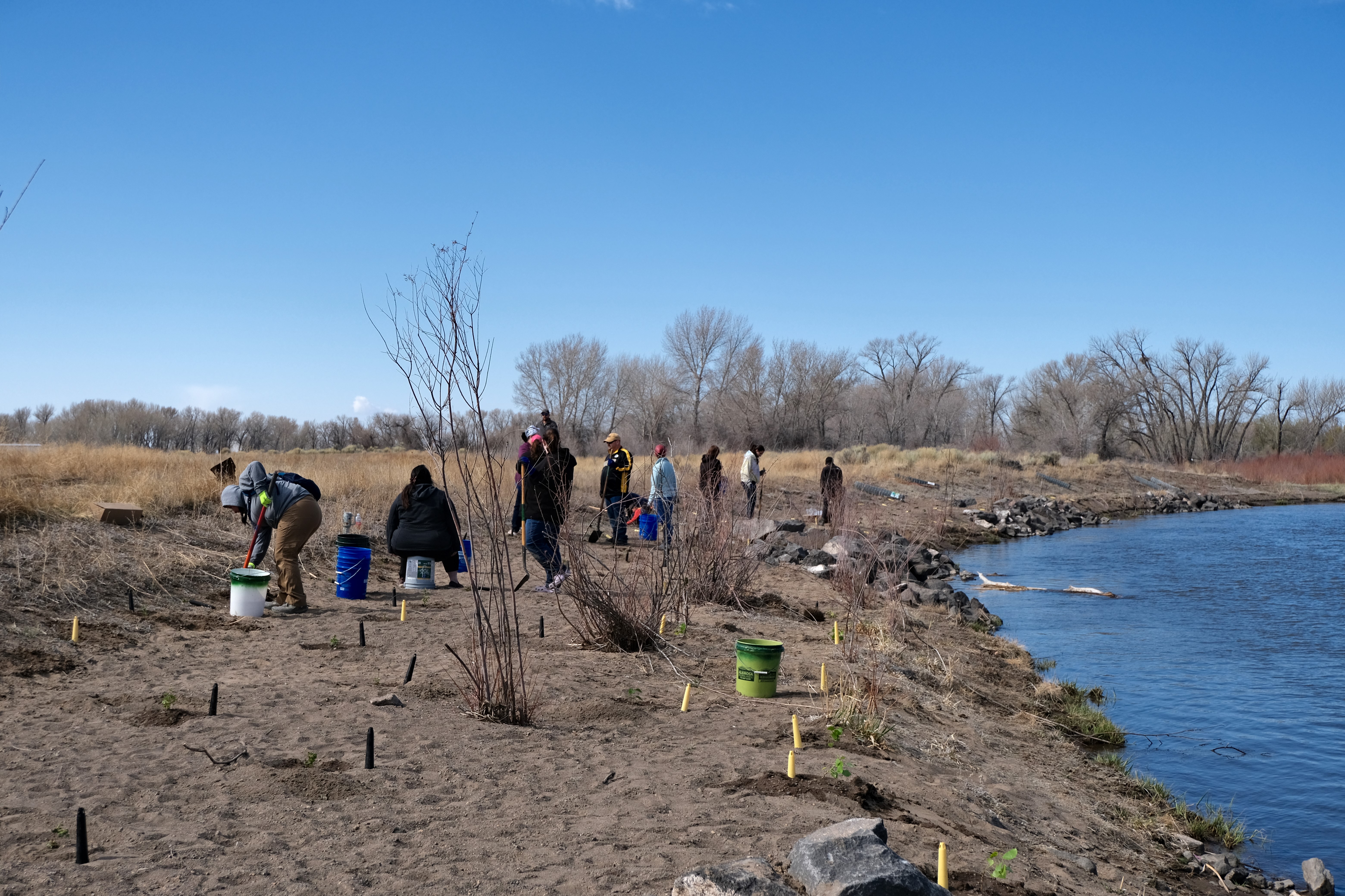 Volunteers help plant around 300 native plants along the Rio Grande river.