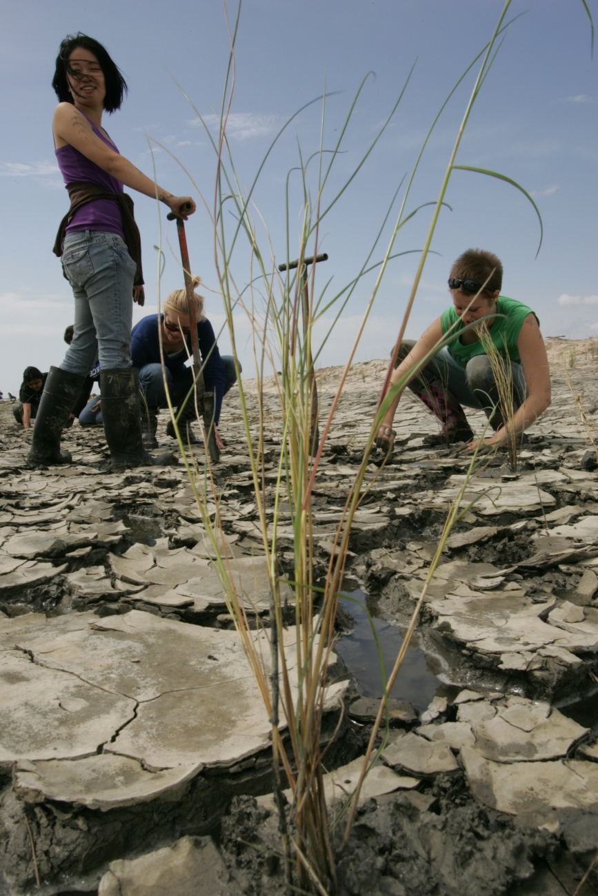 Volunteers work hard to plant marsh grass at Big Branch National Wildlife Refuge.