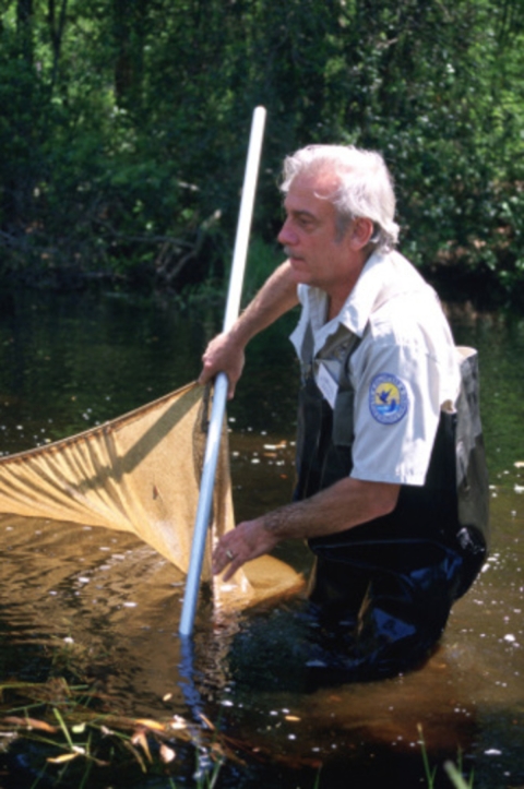 Fish and Wildlife Service volunteers with logo seining for aquatic life in refuge waters. Vertical.