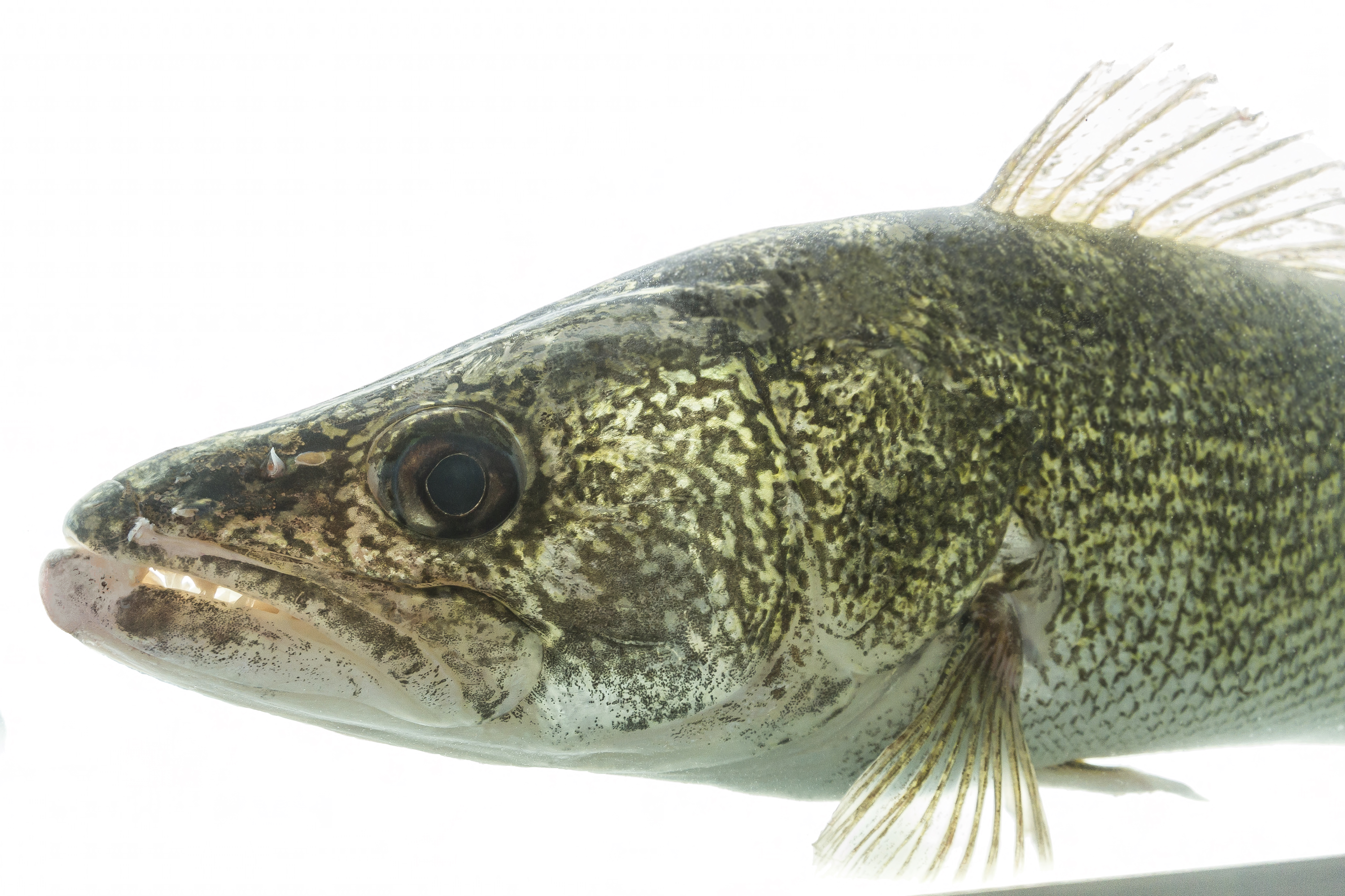 The walleye is a freshwater fish in the perch family that is a popular and commonly-stocked game fish. Walleye are long and thin, primarily gold and olive in color, with a white belly. The back is crossed with five or more black bands. They have two dorsal fins—one spiny and one soft-rayed. The walleye’s mouth is large with sharp teeth, and it has low-light vision that helps it find prey at night.