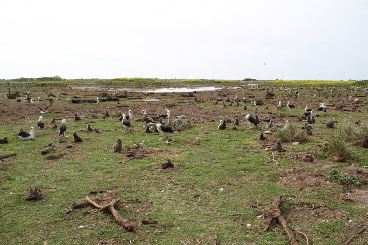 Washed over area of Eastern Island after a tsunami generated by a powerful earthquake off the coast of Japan struck the refuge at 11:36 PM on Thursday, March 10th and continued for the next few hours. While Spit Island was completely washed over, Eastern and Sand Island were 60% and 20% washed over, respectively. Image taken from USFWS Pacific Region Flickr page.