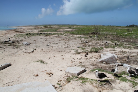 Washed over area of Eastern Island after a tsunami generated by a powerful earthquake off the coast of Japan struck the refuge at 11:36 PM on Thursday, March 10th and continued for the next few hours. While Spit Island was completely washed over, Eastern and Sand Island were 60% and 20% washed over, respectively. Image taken from USFWS Pacific Region Flickr page.