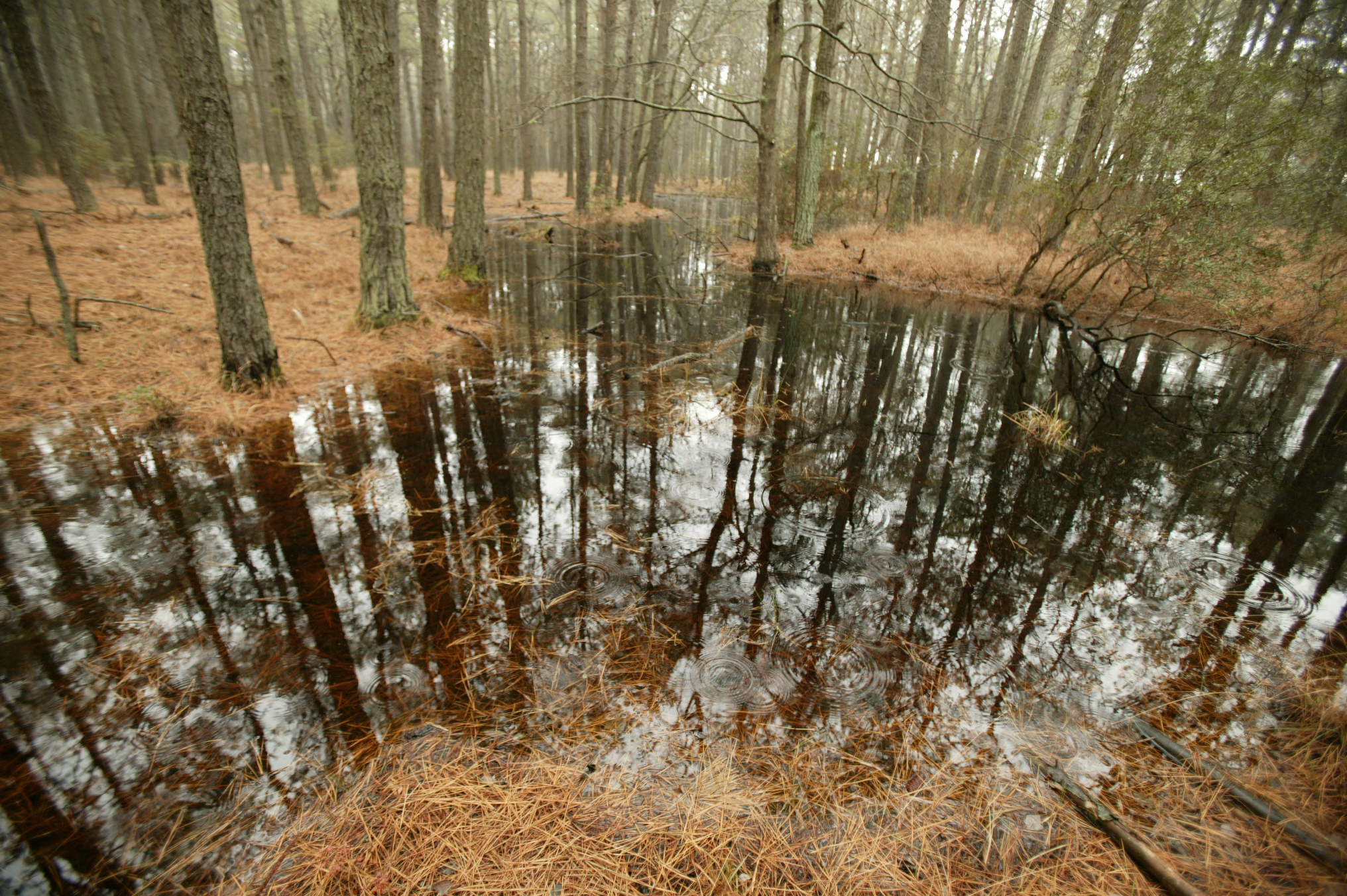Water drops splash on a wetland area of the pine forest