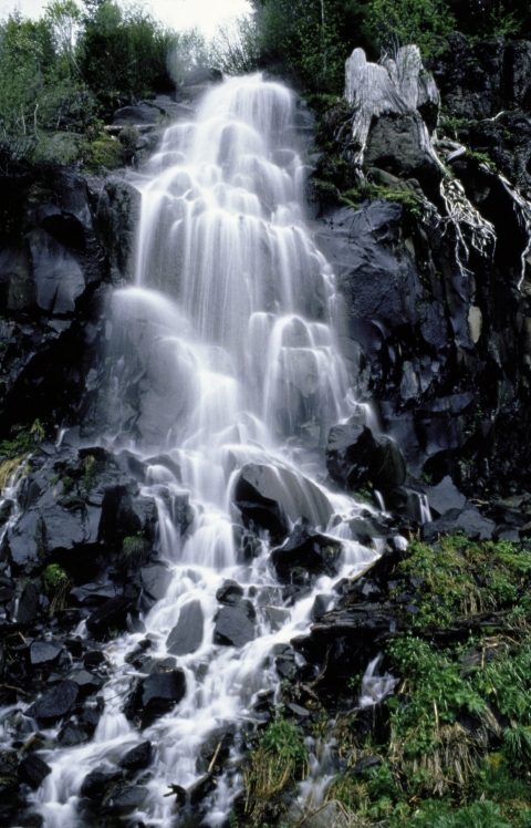A scenic view of a cascading waterfall photographed in central Oregon.