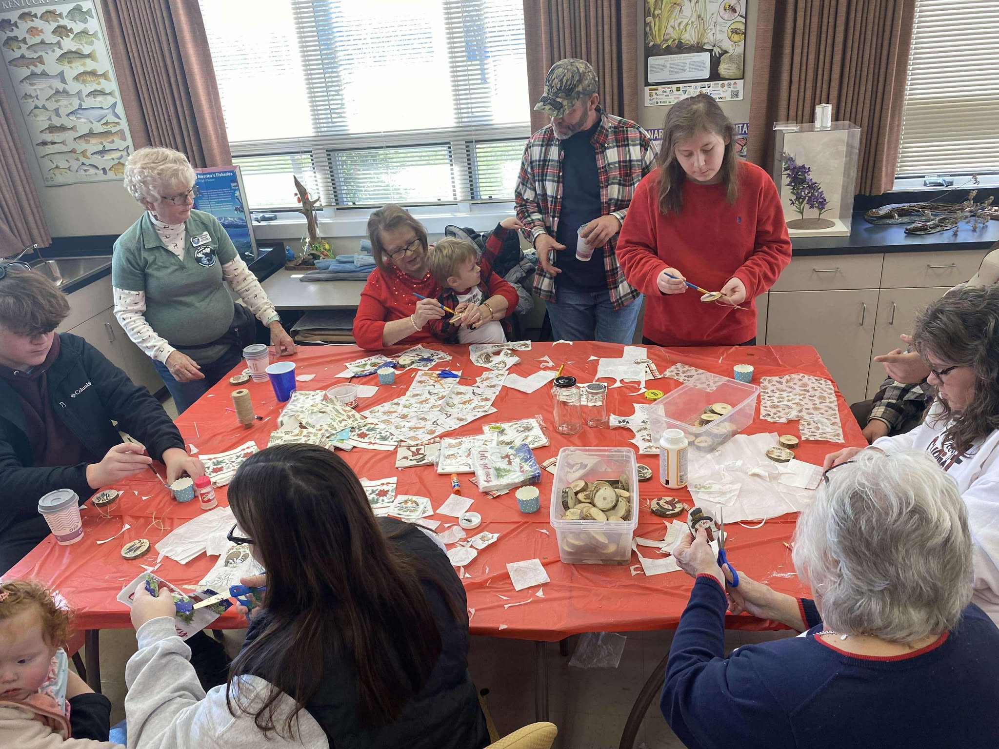 Attendees of Wolf Creek National Fish Hatchery's 2025 Holiday Open House making various nature-themed ornaments.