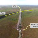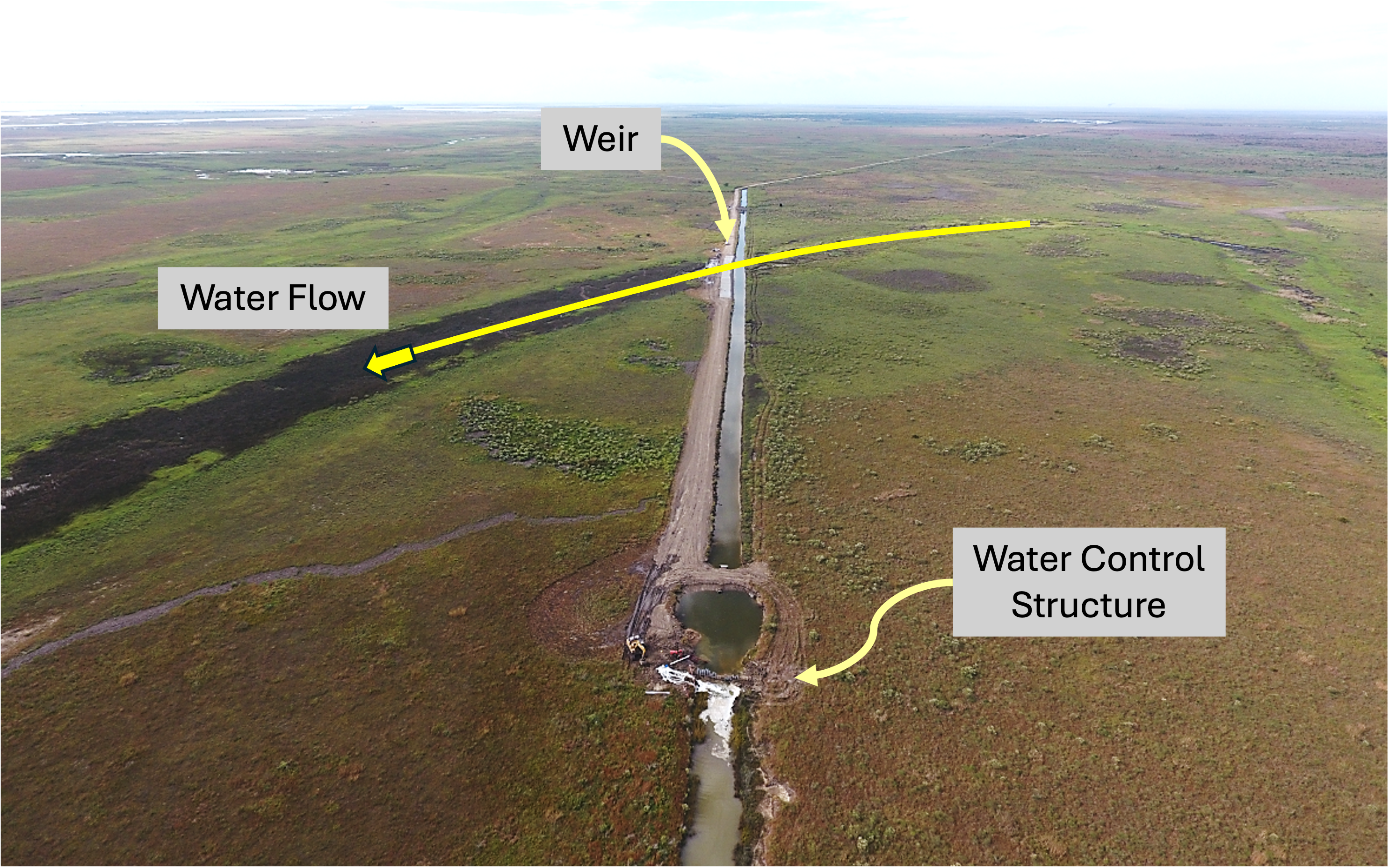 Looking towards the west, the weir will allow rainfall runoff to cross the ditch and flow into the slough (Wharton Bayou). The water control structure raises the elevation of water in the ditch so that flows will travel to the south via the weirs. During extreme flow events, the control structure will allow water to also leave the system and flow into Chocolate Bay directly.