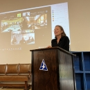 The Service's Northeast Regional Director Wendi Weber delivers opening remarks at a Connecticut River Watershed Partner Meeting at the Arcadia Wildlife Sanctuary in Easthampton, Massachusetts, while virtual participants tune in on screen.