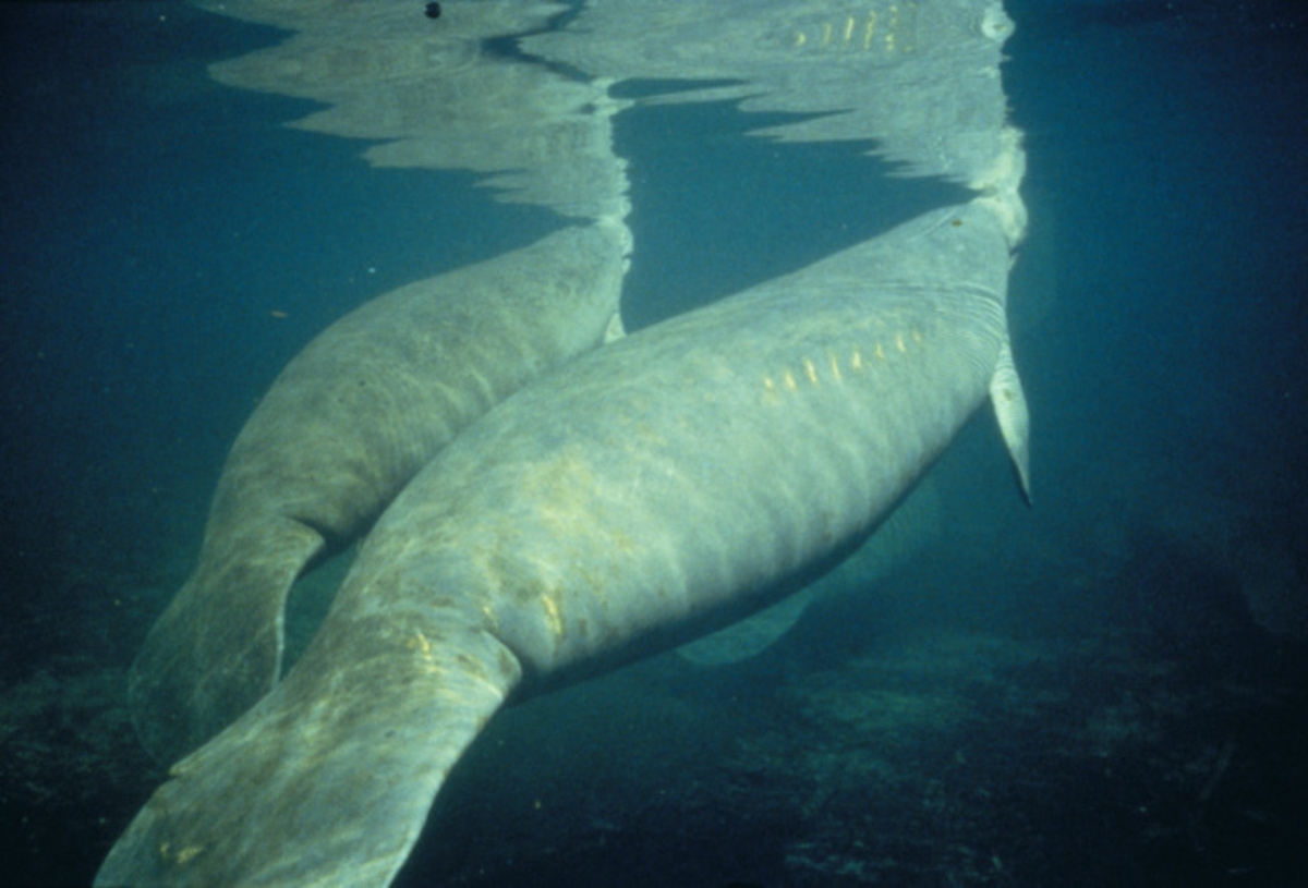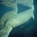 Two manatee surfacing to breathe in Crystal River National Wildlife Refuge. Note scar on back of one manatee from boat propeller. For more information on manatees visit http://www.fws.gov/northflorida/manatee/manatees.htm