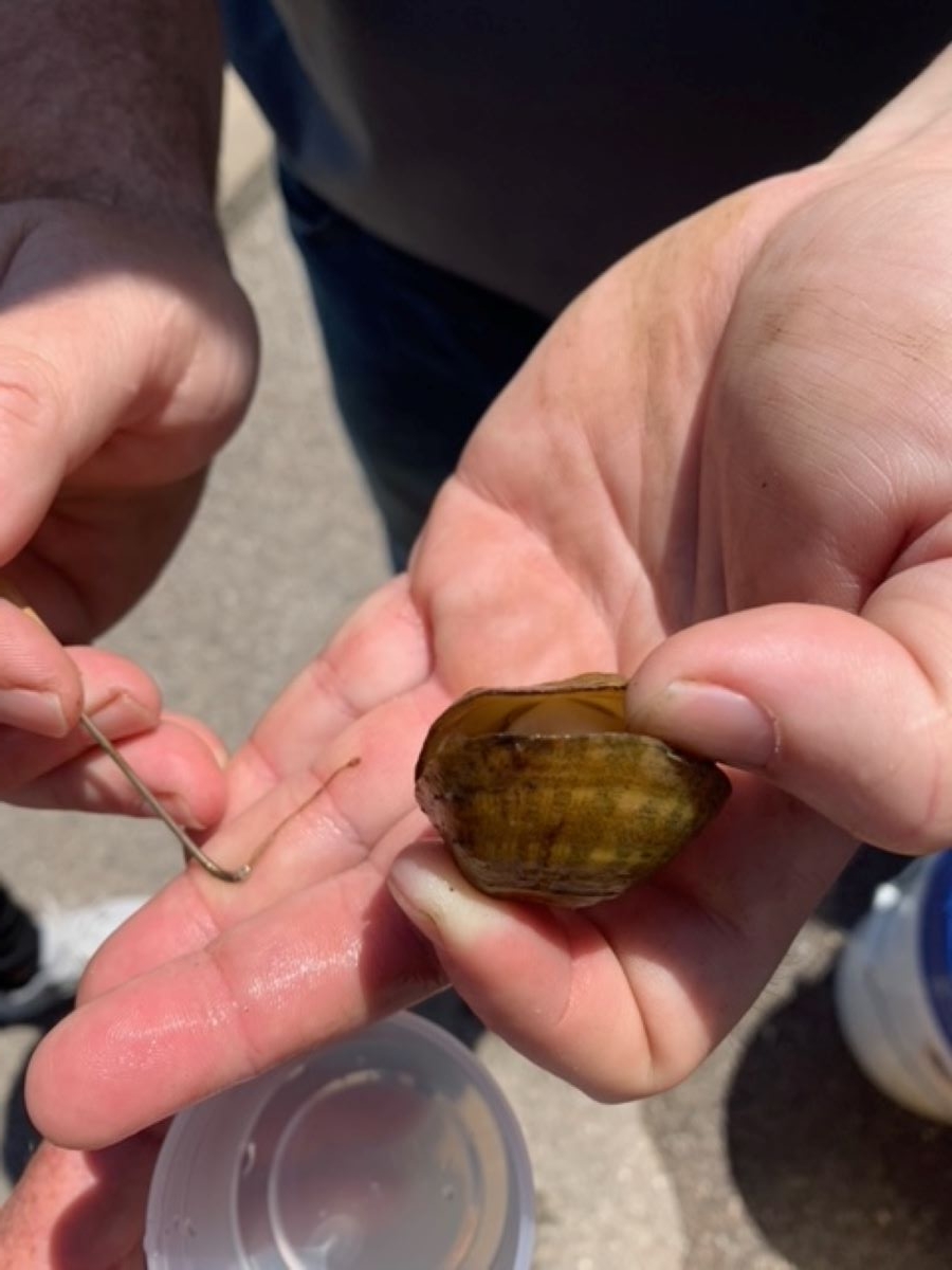 This is a Western Fanshell brooder. Its glochidia are stored in conglutinates that resemble small worms.