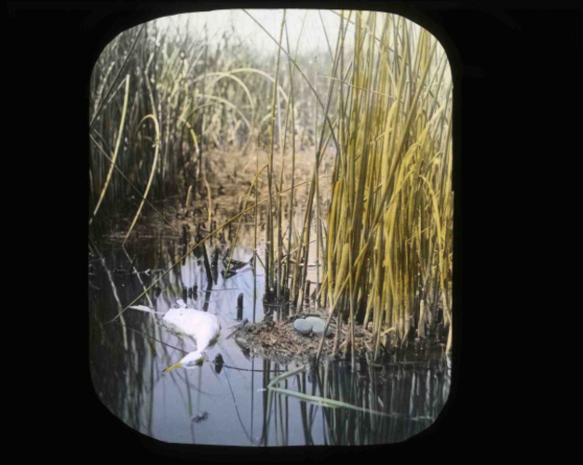 A dramtic shot by Finley and Bohlman of a dead Western Grebe in front of its nest and eggs in an effort to end plume hunting at Malheur Lake. Finley and Bohlman were later successful in ending plume hunting at Malheur when it became a bird refuge in 1908.