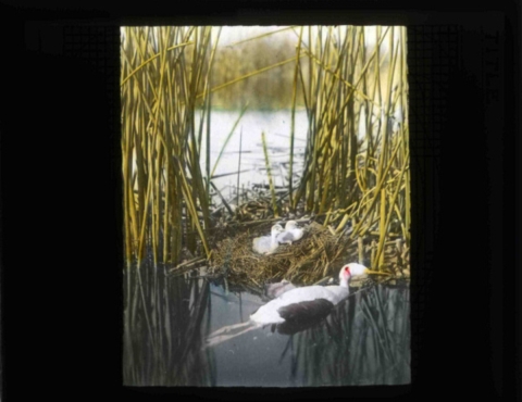 A dramatic presentation by Finley and Bohlman of a dead Western Grebe in front of its young, notice the red coloring at the neck of the Grebe. Finley and Bohlman were out the end the feather hunting that was destroying habitats of birds, especially the egret and grebe colonies in Malheur. They were successful through their photographs and Malhuer was named a bird refuge in 1908 by president Roosevelt.