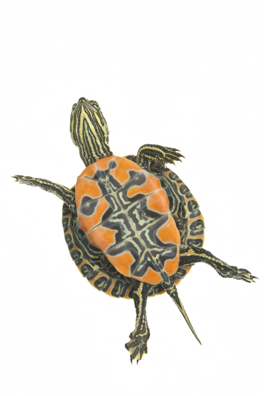 Western painted turtle plastron at Gavins Point National Fish Hatchery in Yukton, South Dakota. The Western Painted turtle is the largest of the painted turtles and the one with the most intricate pattern.
