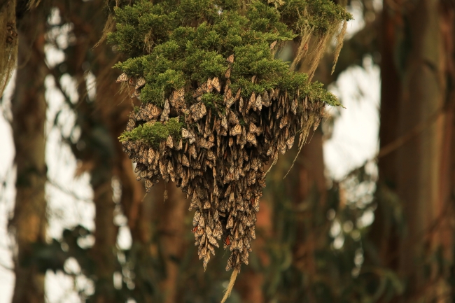 A cluster of overwintering western population monarch butterflies rest on trees in California.