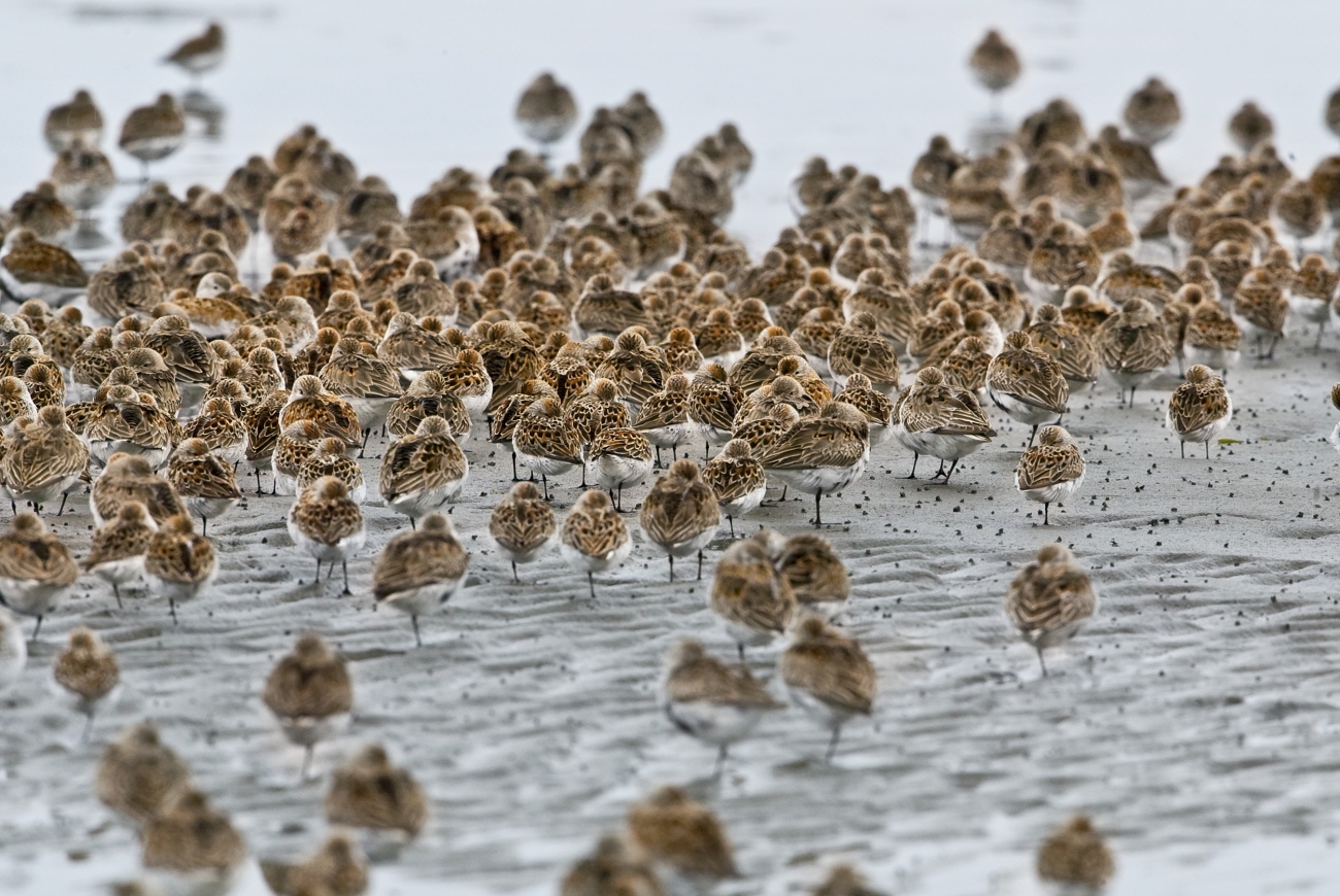 Western sandpipers roost on the intertidal flats at Grays Harbor National Wildlife Refuge in Washington state.