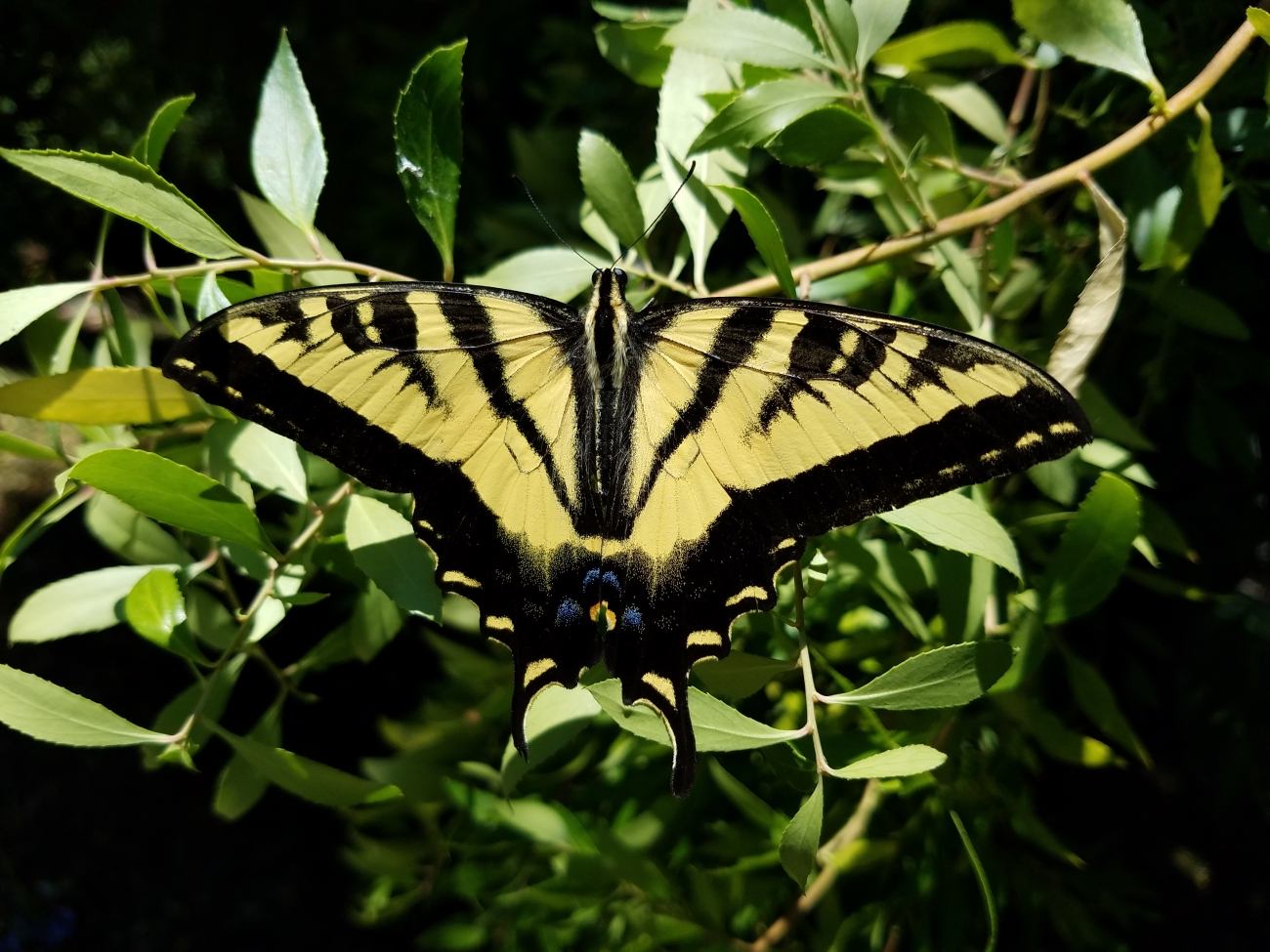 A Western tiger swallowtail butterfly (Papilio rutulus) with wings spread wide.