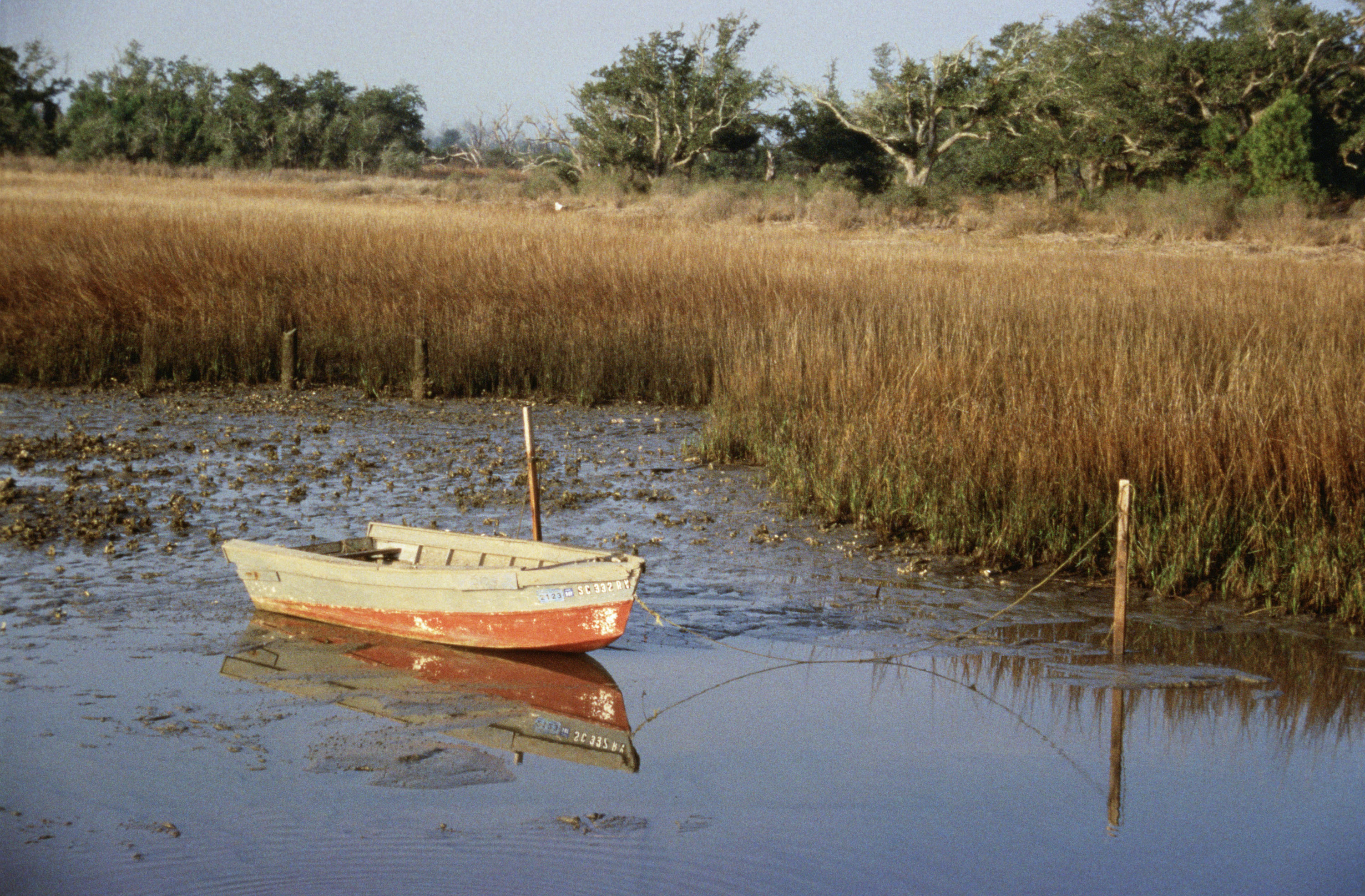 Small boat aground in marsh with exposed oysters at low-tide.