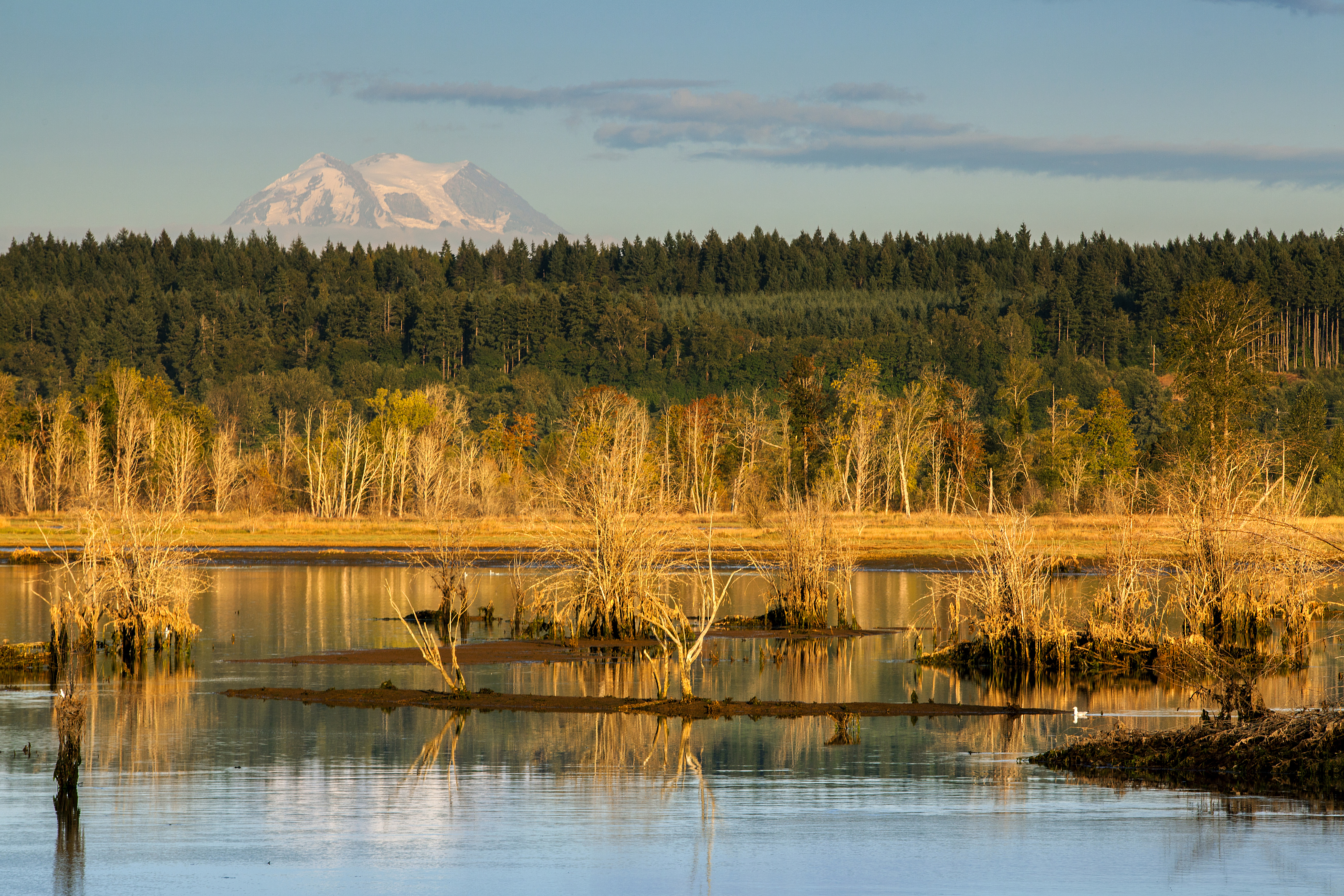 Water runs through Nisqually National Wildlife Refuge, Washington: Refuge wetlands. In the background Mount Rainier is visible.