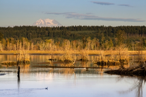 Water runs through Nisqually National Wildlife Refuge, Washington: Refuge wetlands. In the background Mount Rainier is visible.