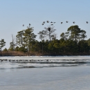 Canada geese fly over a partially frozen wetland at Blackwater National Wildlife Refuge. There are also Canada geese standing on the ice and a giant bald eagle nest is in the far background.