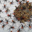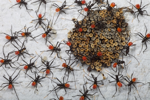 Wheel bug nymphs hatching in Spring. From the Assassin bug family.