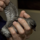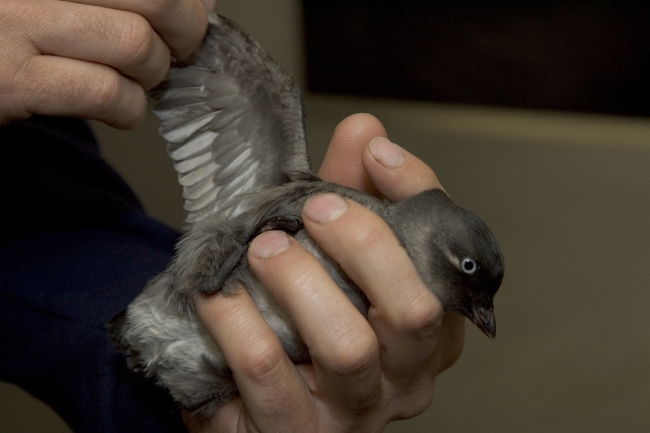 Dazzled by lights, this whiskered Auklet chick landed on the U.S. Fish and Wildlife Service MV Tiglax while traveling through the Aleutina Islands near Kasatochi. After photographing the chick, it was turned loose at sea.