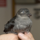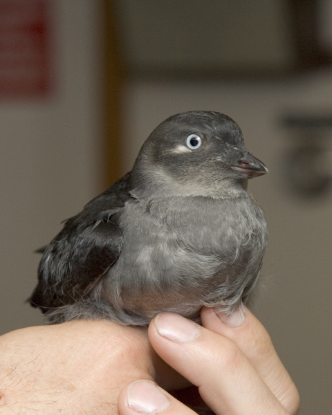 Dazzled by lights, this whiskered Auklet chick landed on the U.S. Fish and Wildlife Service MV Tiglax while traveling through the Aleutina Islands near Kasatochi. After photographing the chick, it was turned loose at sea.