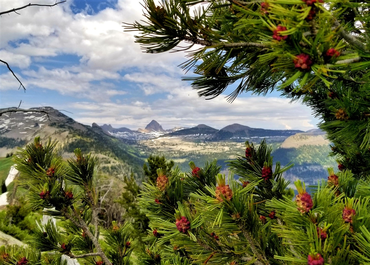 A view of the Teton mountain range through the branches of a whitebark pine.