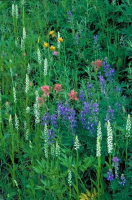 Stems with white orchid blossoms among associated species including Paintbrush and Lupine. For additional resources about wildflowers visit the National Plants Database http://plants.usda.gov/.