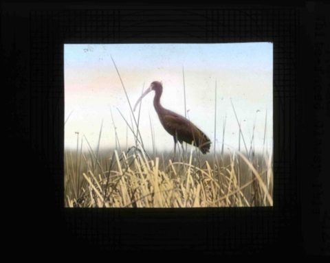 Hand painted glass slide of a white-faced ibis at Malheur lake in 1908 by Finley and Bohlman.