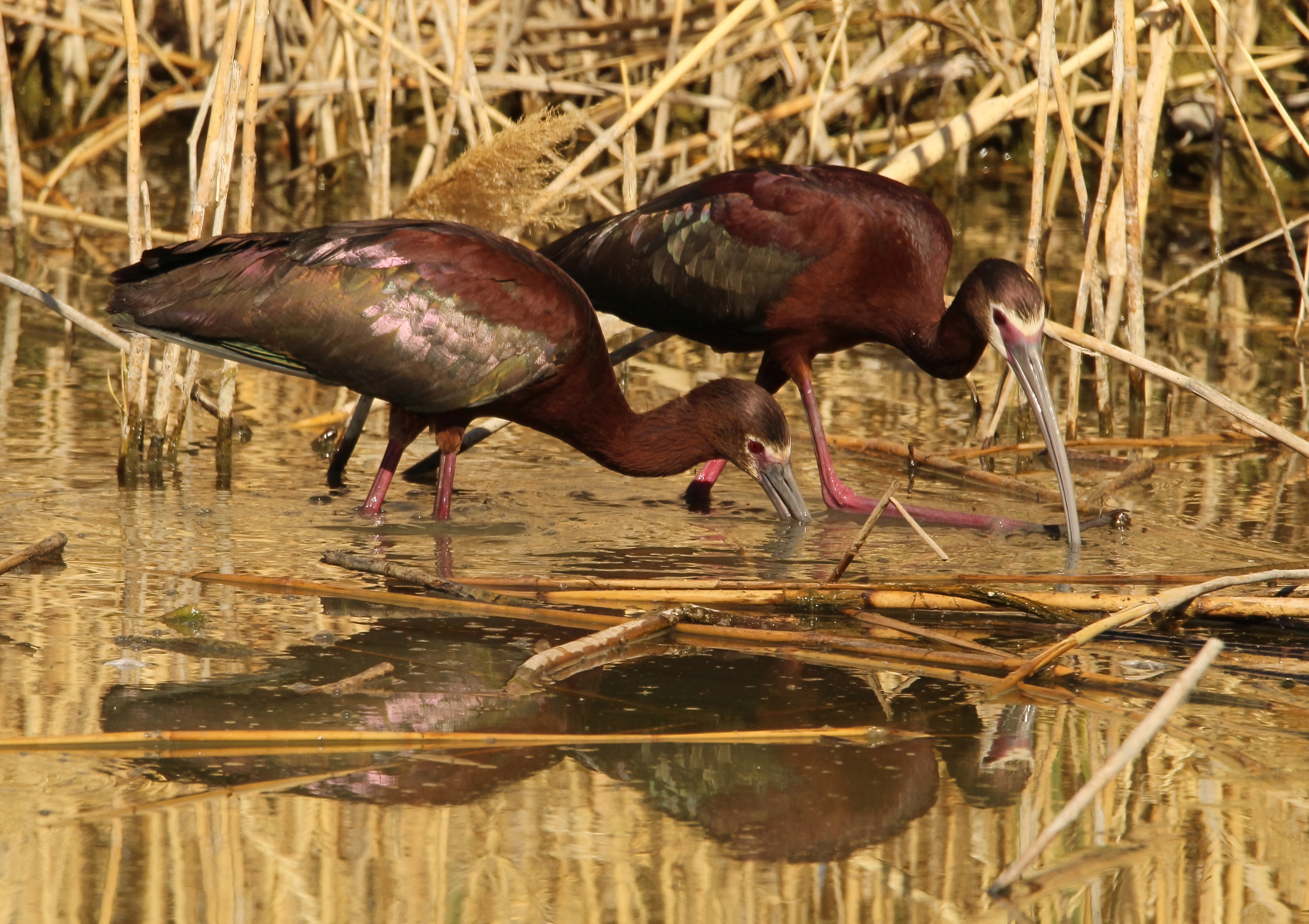 A pair of white-faced ibis foraging for food at the Bear River Migratory Bird Refuge