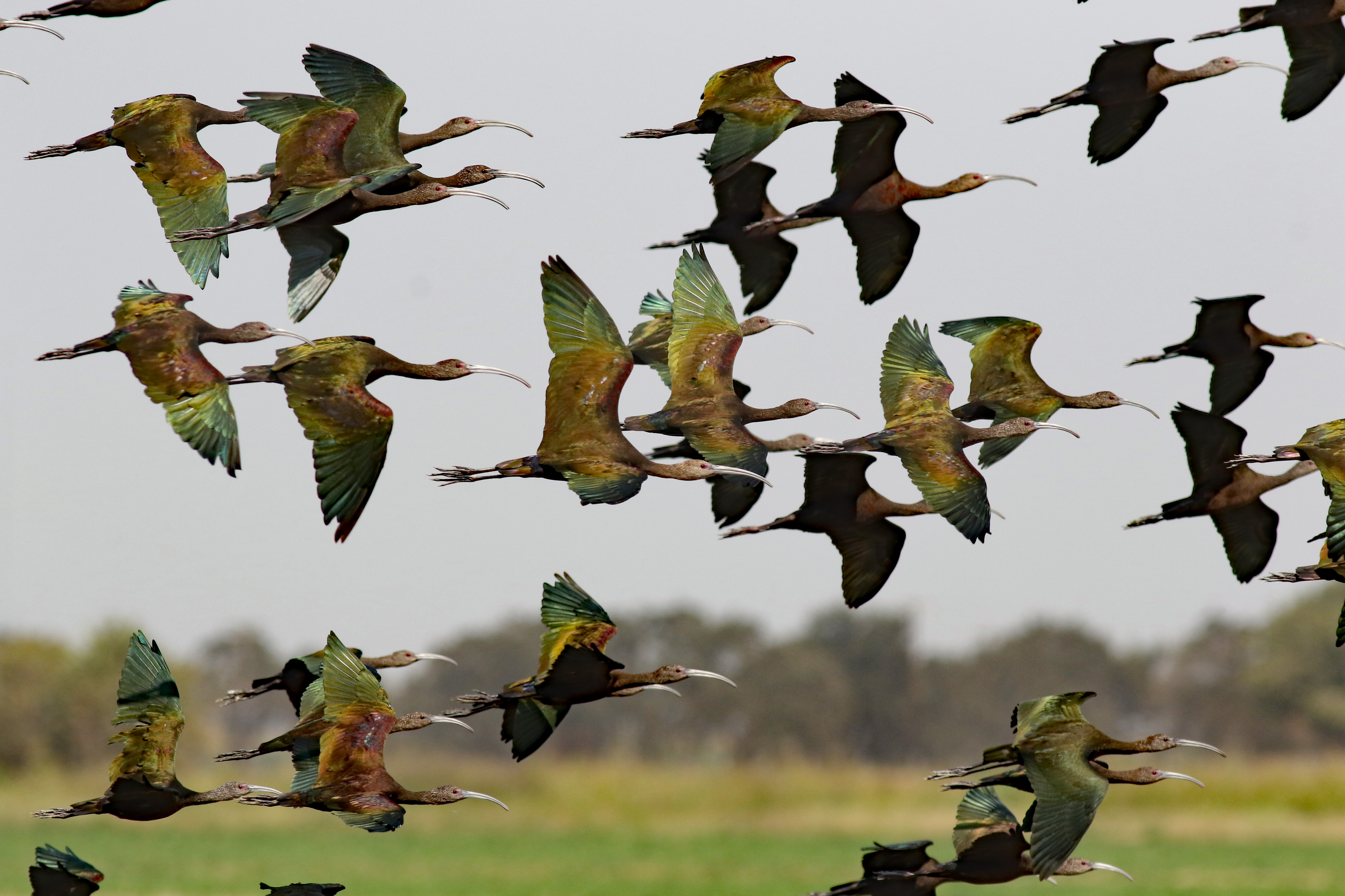 A flock of iridescent white-faced ibis flies over uplands at the San Joaquin River National Wildlife Refuge in California.