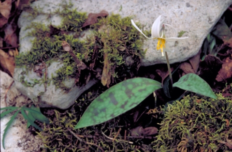 Single white nodding blossom and green spotted leaves. For additional resources about wildflowers visit the National Plants Database: National Plants Database http://plants.usda.gov/.