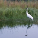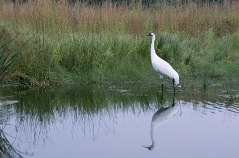 A Whooping Crane photographed at the International Crane Foundation located in Barbaboo, Wisconsin. The Whooping Crane is an endangered species of which an estimated population of 383 continue to exist in the wild. The Whooping Crane occurs only in North America and is North America's tallest bird.