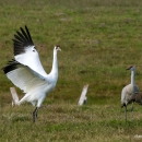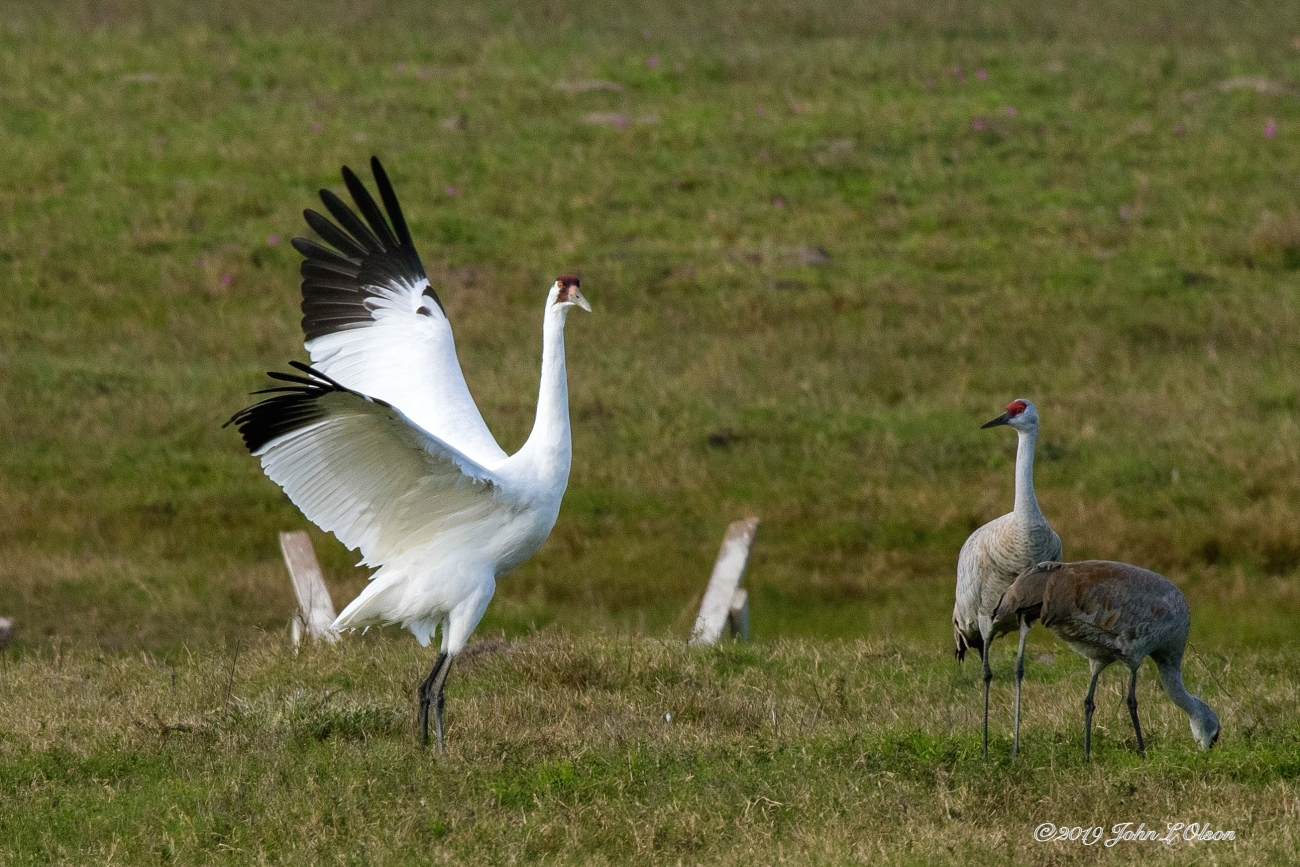 Whooping Crane and Sandhill Cranes in a Field