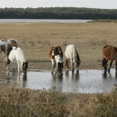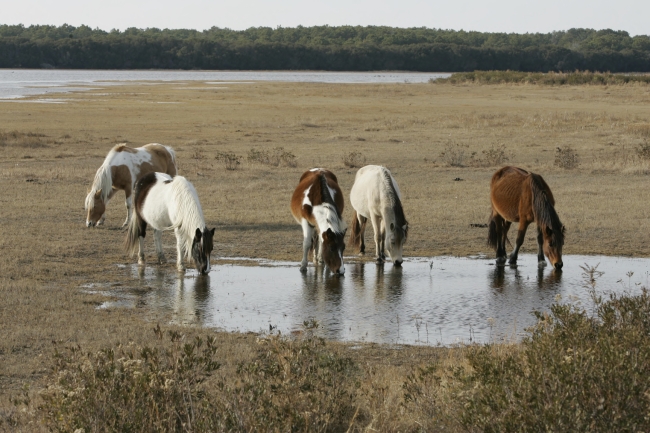 Two herds of Chincoteague ponies graze freely on Assateague Island.
