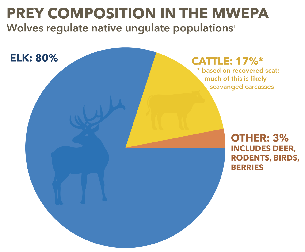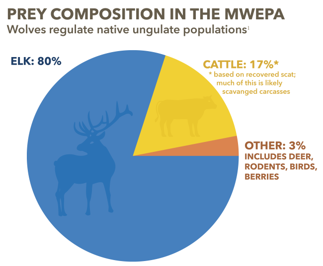 Mexican wolves prefer native ungulates, particularly elk, as prey. They will also take advantage of scavenging opportunities, including cow carcasses.