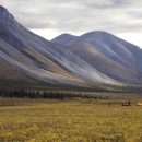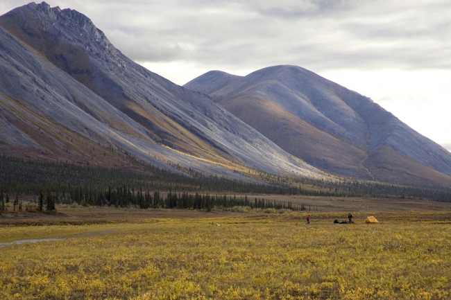 This picture shows a campsite surrounded by massive mountains at the refuge. The Arctic National Wildlife Refuge, a vast and beautiful wilderness, is an intact continuum of six different ecological zones spanning some 200 miles north to south.