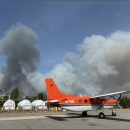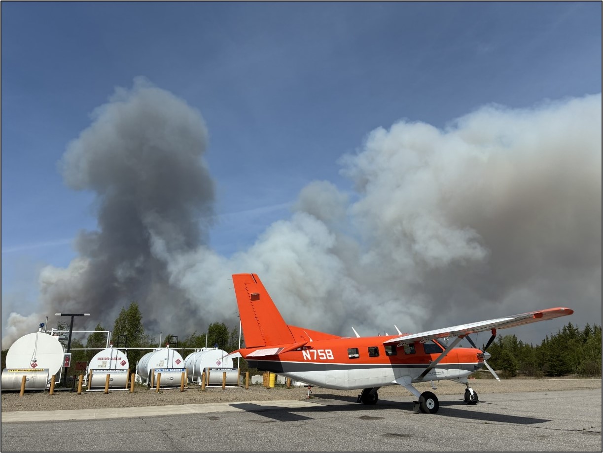 Smoke billows from not-too-distant wildfires as survey crew prepares to depart Lynn Lake, Manitoba.