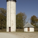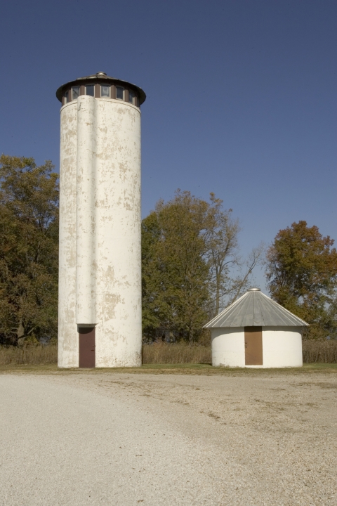 Tall white silo-shaped wildlife observation tower with viewing spaces at top and, next to it, a short round maintenance building with conical roof.
