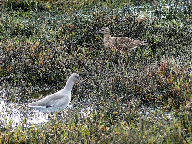 Two shorebirds, a Willet and a Wimbrel walk along the shoreline.