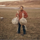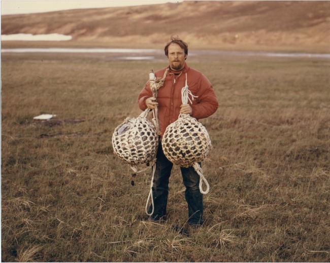 Togiak National Wildlife Refuge; William Arvey, Alaska Dept. of Fish and Game holding two large glass, Japanese fishing floats; Refuge; Togiak National Wildlife Refuge; Personnel; ARLIS; Alaska;