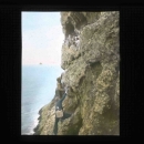Hand painted glass slide of Finley and Bohlman climbing the cliffs at Three Arch Rocks to photograph Common Murres. This shot is an excellent exapmle of the risk and adventure needed in early photograph.