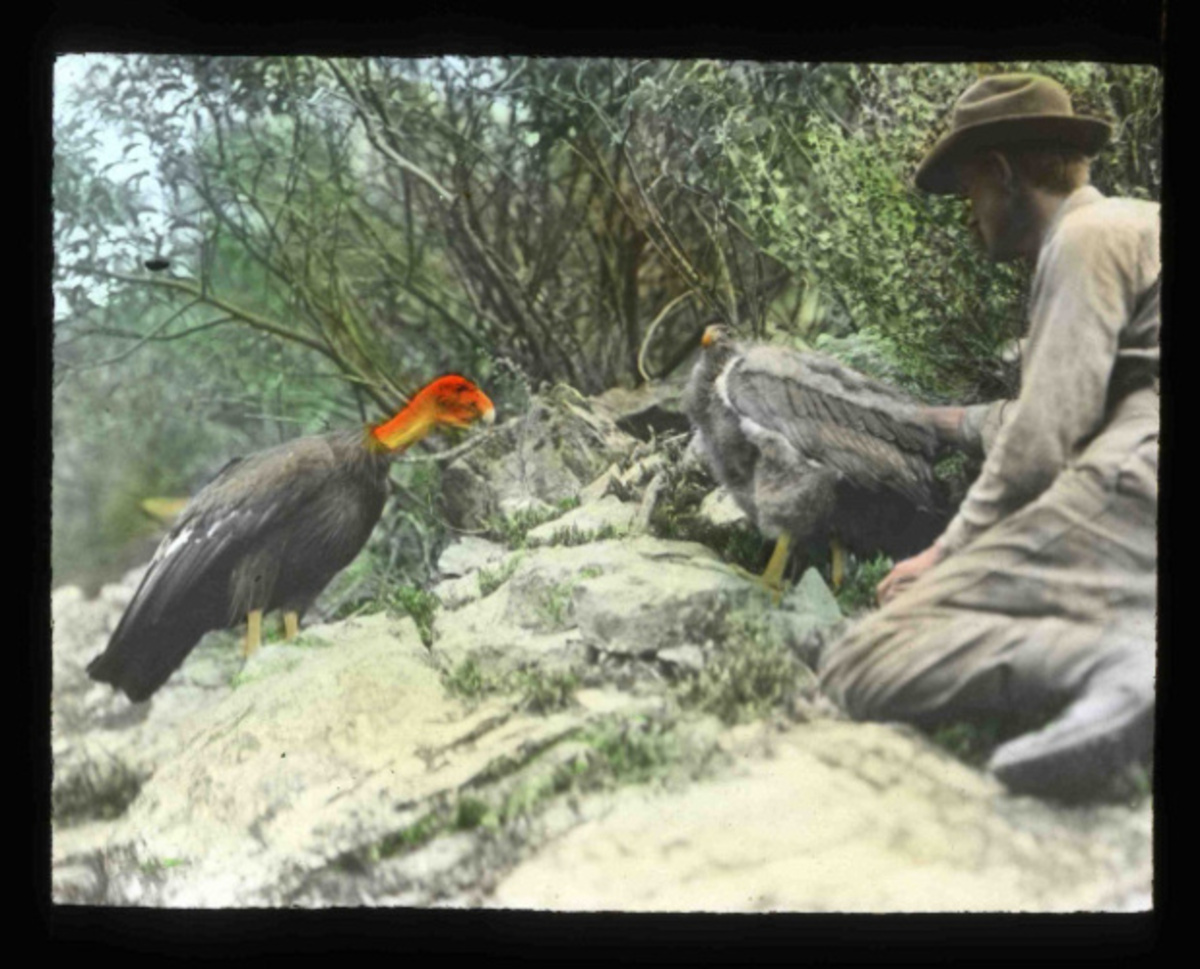 William Finley examining Condors during a 1906 photography trip with his partner Herman Bohlman to a Condor nest site near Los Angeles California