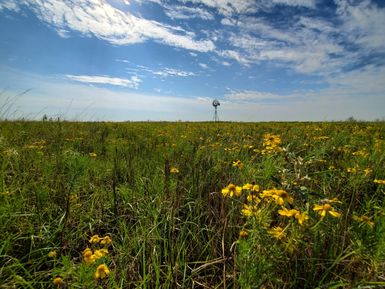 Photo of a windmill and flowers in the prairie at Attwater Prairie Chicken National Wildlife Refuge by Meredith Haley/USFWS