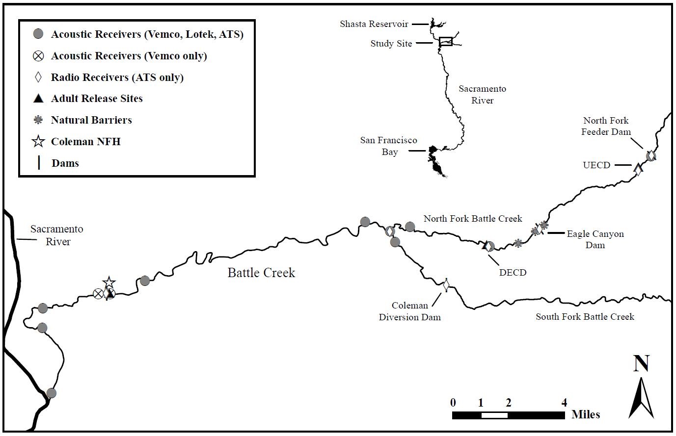This map shows salmon-release sites, natural and human-made barriers, and locations of acoustic and radio receivers on Battle Creek associated with Service efforts to support endangered Sacramento River winter-run Chinook salmon and establish a second population outside of the Sacramento River. Since 2018 the Service has released hatchery-produced winter-run juvenile Chinook salmon into Battle Creek and monitored adult returns through a collaboration of the Red Bluff Fish and Wildlife Office and Coleman National Fish Hatchery.