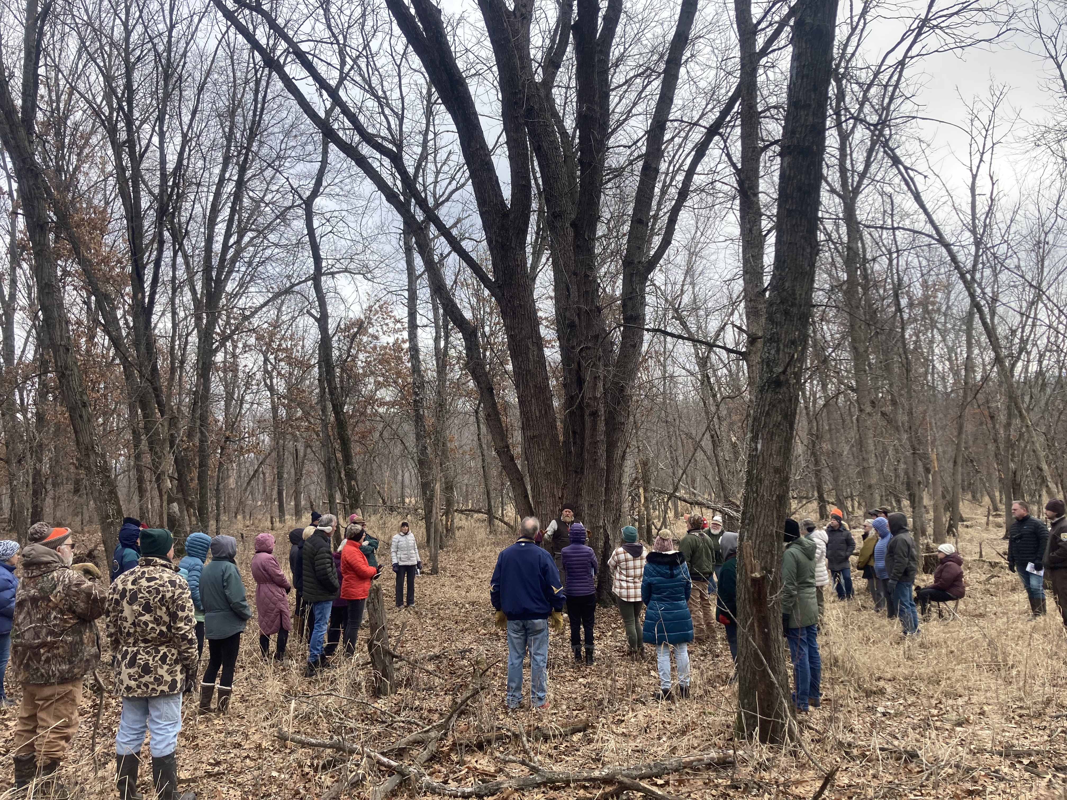 A Refuge forester and partners describe winter tree identification clues to visitors on a walk through the floodplain forest.